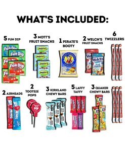 DIMENSIONS: 12.2in x 10.5in x 3in. Gift wrapping and message available at checkout. Contents included: 1 ZeeZee’s Grahams. 1 Chex Mix. 1 Famous Amos Cookies. 1 Cheez-its. 1 Goldfish. 1 PB Crackers. 1 Pringles. 1 Mini Cookies. 1 PurePop. 2 Rice Krispies. 1 ZeeZee’s Bar. 5 Fun Dip. 3 Mott’s Fruit Snacks. 2 Welch’s. 6 Twizzlers. 2 Lollipops. 3 Kirkland Chewy. 5 Laffy Taffy. 3 Quaker Chewy. 1 Nature Valley Oats & Honey