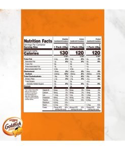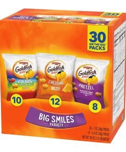 Variety pack includes: 10 single-serving packs of Goldfish colors. 12 packs of Goldfish cheddar. 8 packs of Goldfish pretzels