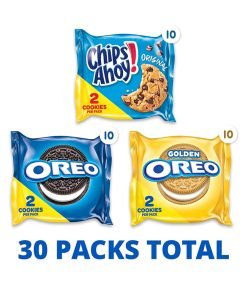 One Nabisco Sweet Treats Cookie Variety Pack with 30 two-cookie snack packs. including 10 each of OREO Original. OREO Golden and CHIPS AHOY (packaging may vary)